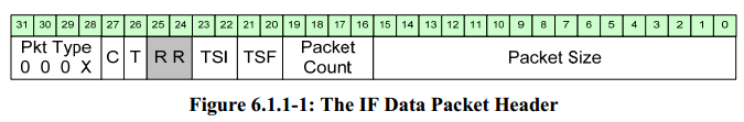 : Packet Count shall increment in each consecutive IF Data packet having the same Stream Identifier and the same packet type ,包计数器,可以对连续的IF data packet 进行计数,这些packet具有相同的Stream Identifier 和packet type。