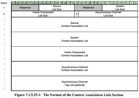 如果 channel tag 被使用了的话,那么可以使用异步信道上下文 关联列表。它包含 一个context packet 的stream ID 的列表去关联信道。它包含一个“A”bit位,如果它为1 的话则 Asynchronous-Channel Tag List 与 Asynchronous-Channel Context Association List有相同的大小,