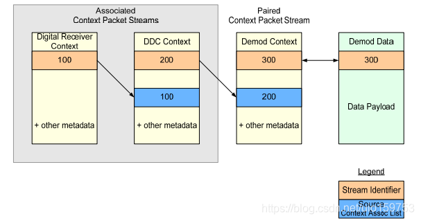因为大部分的数据都是经过一连串的处理才的出来的,比如,信号经过了DDC,解调器,等一些器件,source context association list 便提供了将该数据与一些context packet关联的能力,