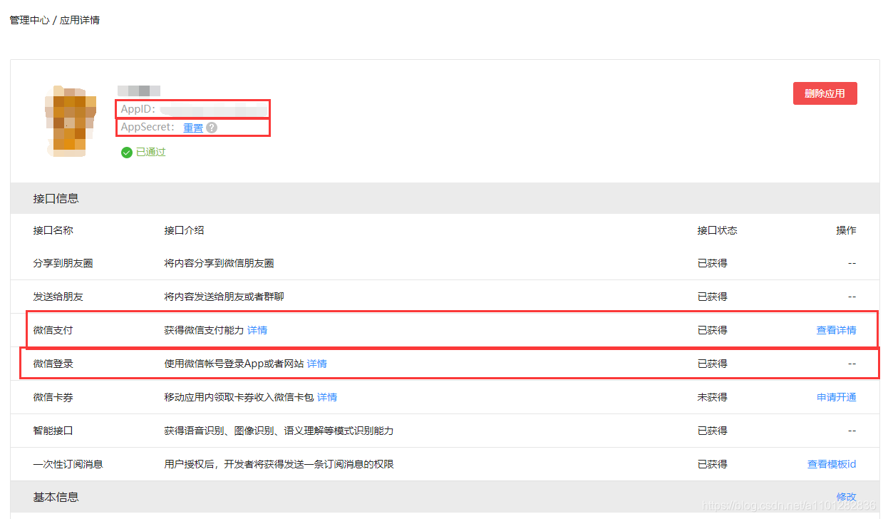 审核通过之后微信开放平台会为我们生成对应的AppID,以及设置后面需要用到的AppSecret。