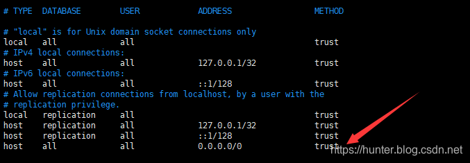 METHOD:认证方式,常用的有ident,md5,password,trust,reject。