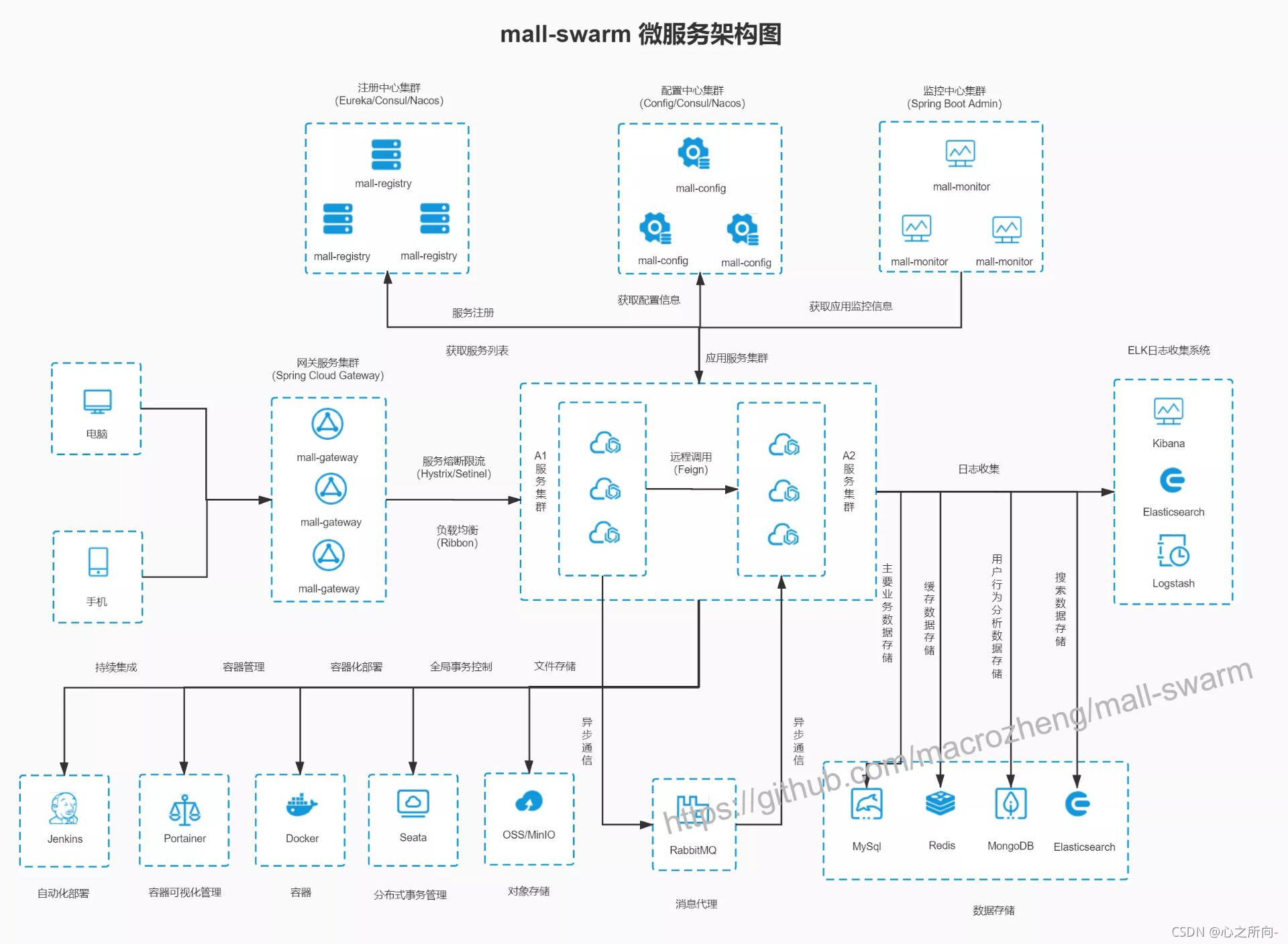 (贴一个网上一个项目的架构图,更深入了解一下微服务架构)