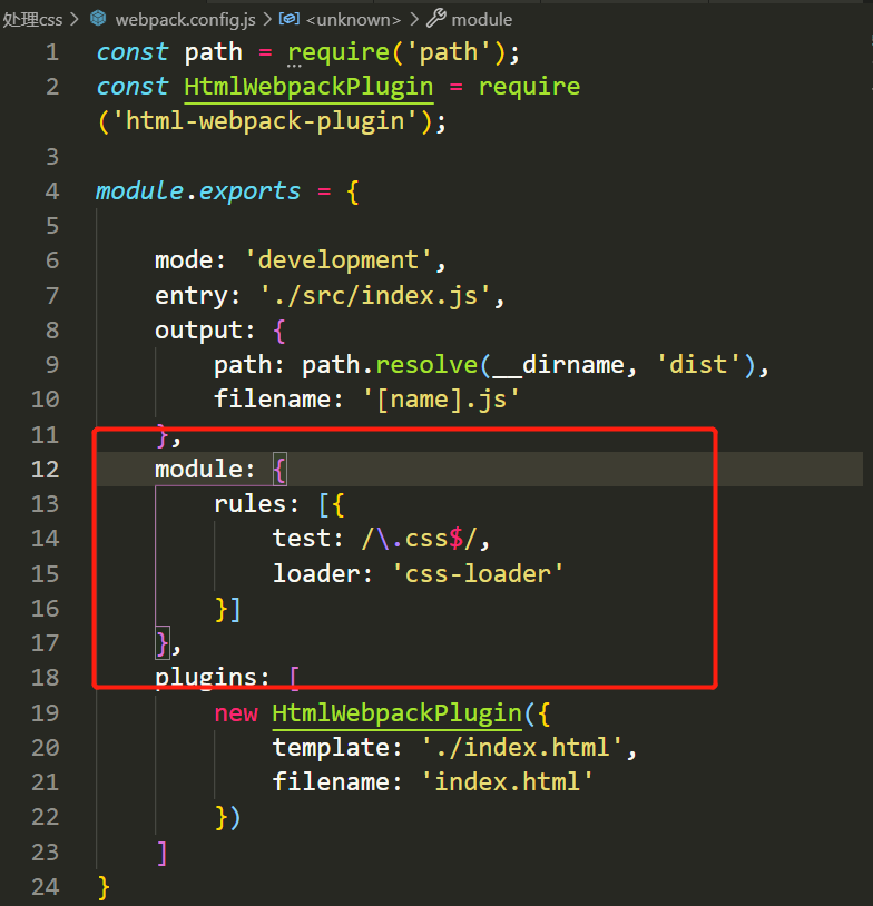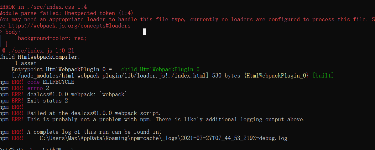 这时候可以看到报错了,说的是您需要一个loader处理该类型文件,这时候就联想到之前说的:loader是处理非js文件的。所以我们需要下载loader的包。这里需要下载css-loader(npm install –save-dev css-loader)。然后在webpack.config.js中配置loader: