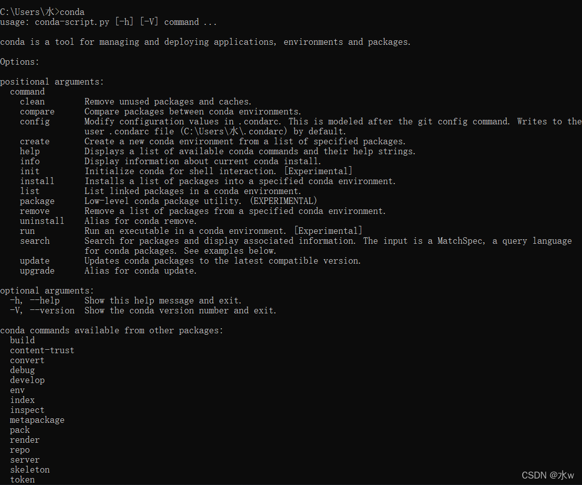 6、测试一下anaconda是否安装成功,输入conda,出现下面现象则表示安装成功了。