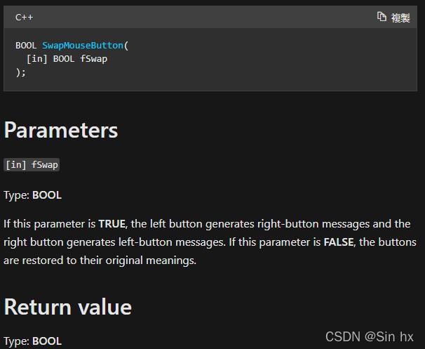 SwapMouseButton只有一个BOOL类型参数,若参为TRUE则交换鼠标左右键,返回值非0;