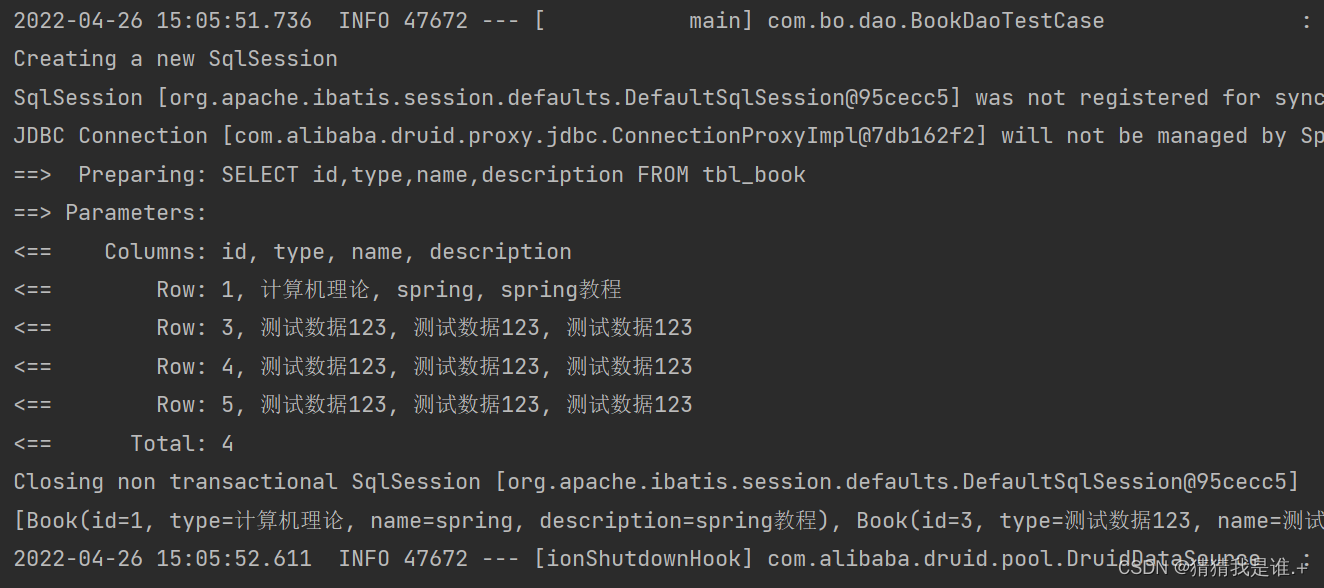 然后在Test文件夹下,建立相应dao的测试类,类上添加注解: