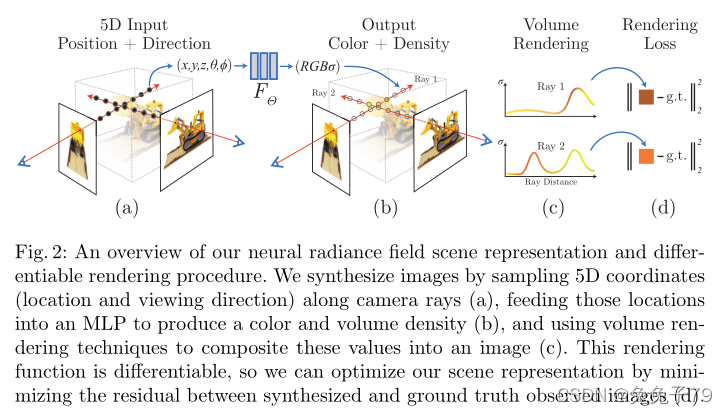 译文:我们通过沿相机光线(a)采样5D坐标(位置和观察方向),将这些位置输入MLP以生成颜色和体积密度(b),并使用体绘制技术将这些值合成图像(c),从而合成图像。这种渲染函数是可微的,因此我们可以通过最小化合成图像和地面真实观测图像(d)之间的残差来优化场景表示。
