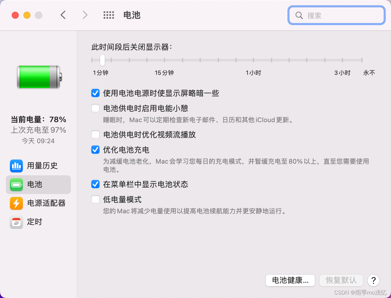 左上角 、 关于本机 、 系统报告… 、 硬件 、 电源内的电池