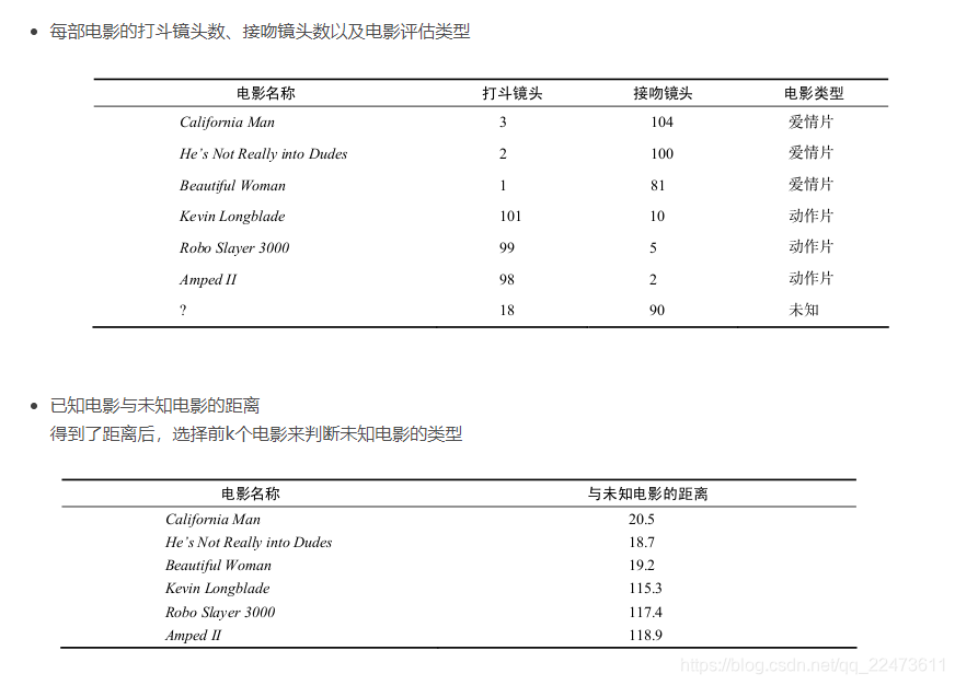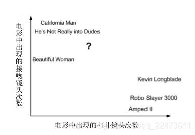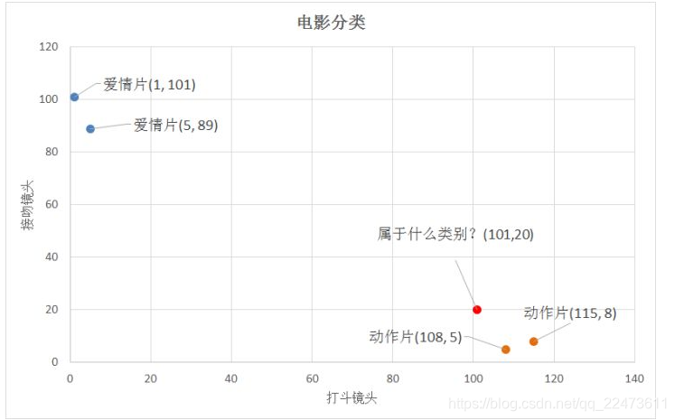 比如,现在我这个k值取3,那么在电影例子中,按距离依次排序的三个点分别是动作片(108,5)、动作片(115,8)、爱情片(5,89)。在这三个点中,动作片出现的频率为三分之二,爱情片出现的频率为三分之一,所以该红色圆点标记的电影为动作片。这个判别过程就是k-近邻算法。