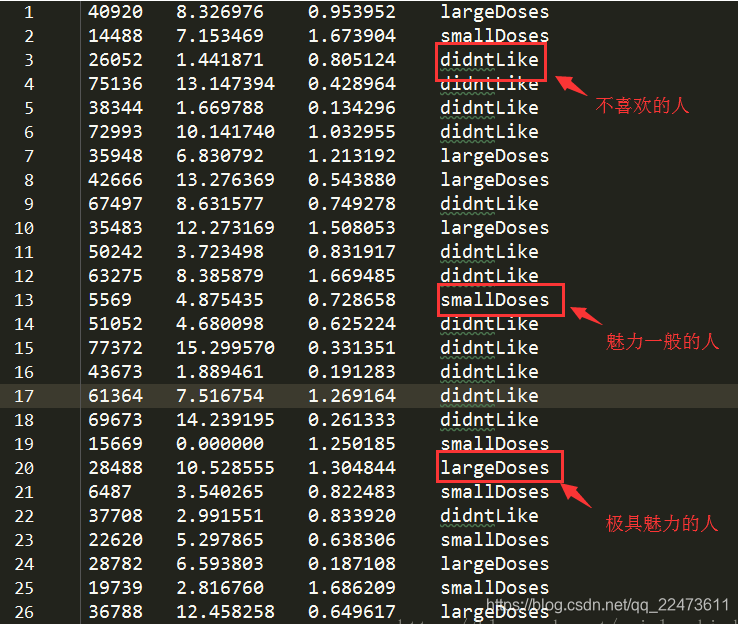 海伦收集约会数据已经有了一段时间,她把这些数据存放在文本文件datingTestSet.txt中,每个样本数据占据一行,总共有1000行。