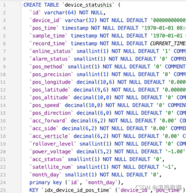 TDengine的存储效率也非常高,在选型过程中,我们进行了2000万条数据的模拟测试。下面是MySQL表结构,一共22个字段和一个联合索引。