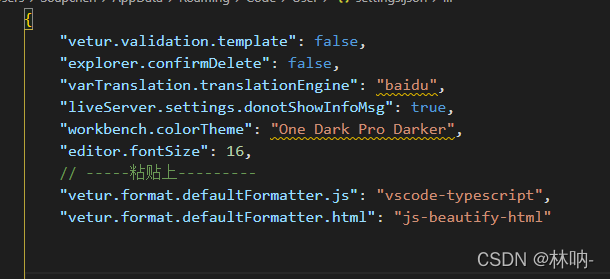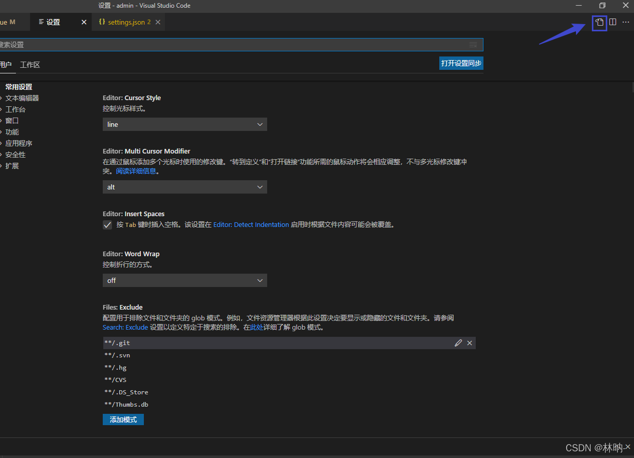 第二步:点击右侧的图标会打开settings.json文件