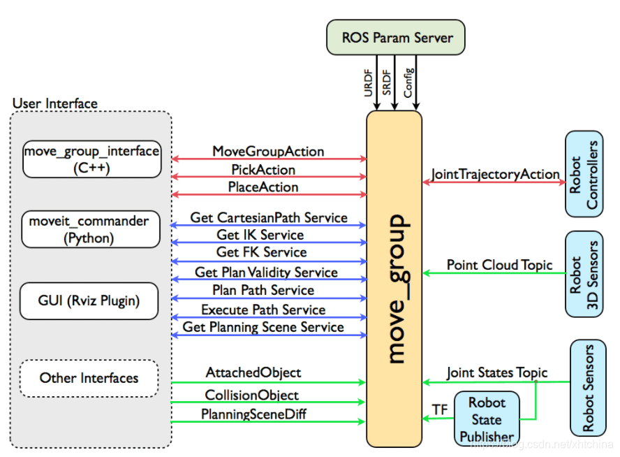 的结构比较容易扩展,不仅具有独立的能力如抓放,运动规划,也可扩展自公共类,但实际作为独立的插件运行。moveit!系统结构图如下: