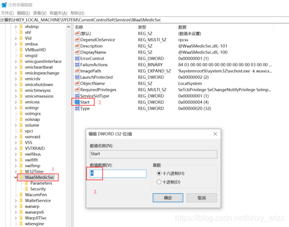 1. 运行“regedit”,打开注册表编辑器,定位到 “HKEY_LOCAL_MACHINE\SYSTEM\CurrentControlSet\Services\WaaSMedicSvc”,右侧找到“Start”键,右键点击“修改”,将数值改为“4”;