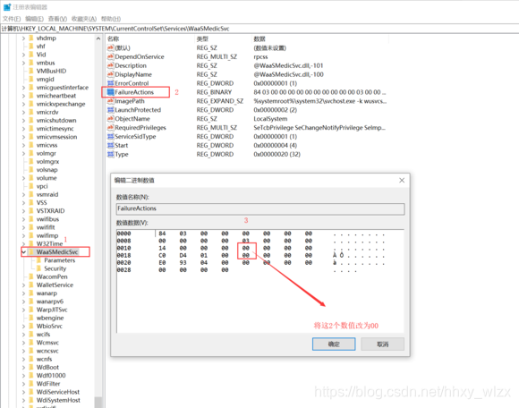 2.再找到“FailureActions”键,右键点击“修改”,修改该键的二进制数据,将“0010”、“0018”行的左起第5个数值由原来的“01”改为“00”,修改完成保存关闭;