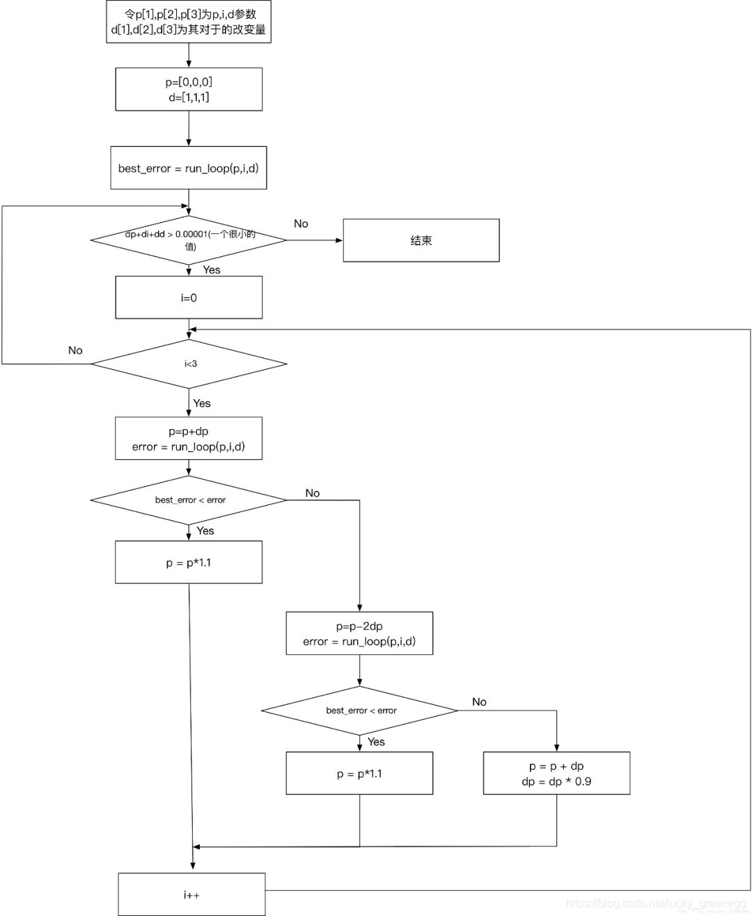 PID控制就是由这三项共同决定的,还有其他应用于无人驾驶汽车的高级控制算法,但是他们都和我们介绍的PID控制的原理相似。我们发现其实PID实现确实不难,但是三个系数的选择却很难,我们可以在我们的控制循环中通过一定的算法不断尝试,下面我提供给大家一种寻找参数的算法: