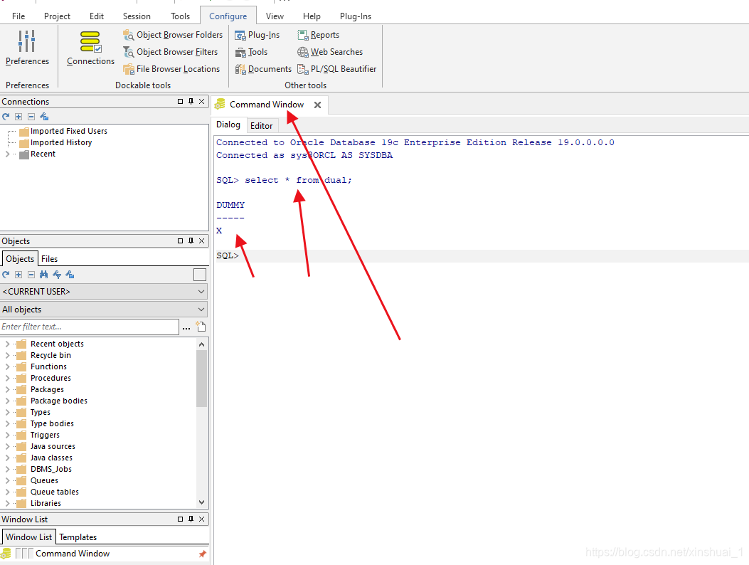 在打开的密令窗口中,输入语句 select * from dual;查询出数据,至此 plsql 链接oracle数据库实例orcl 已经完成。