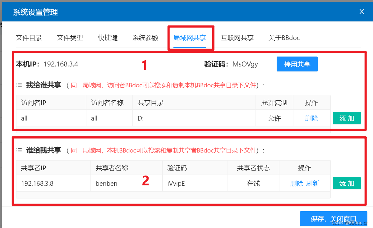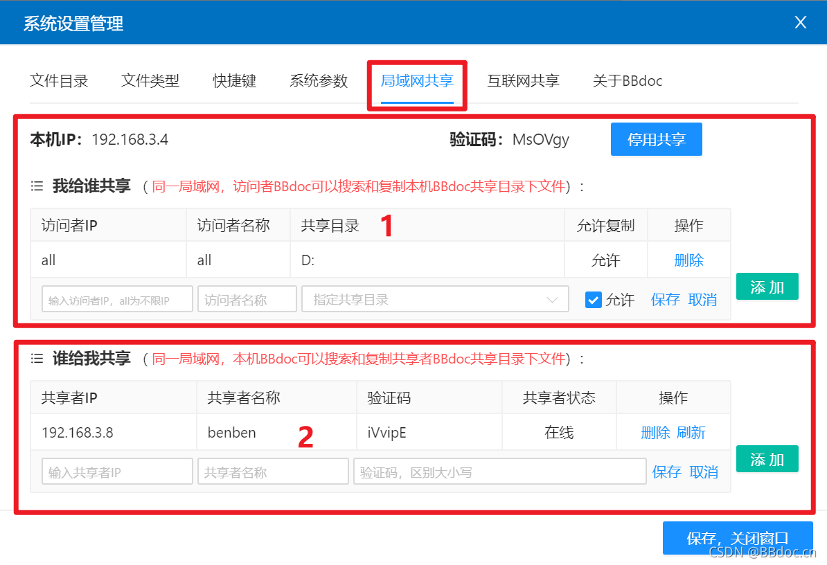 红框2:向共享者索取红框1里面ip地址及验证码在红框2这里进行添加,添加完毕保存并立即重启BBdoc软件就可以使用了。