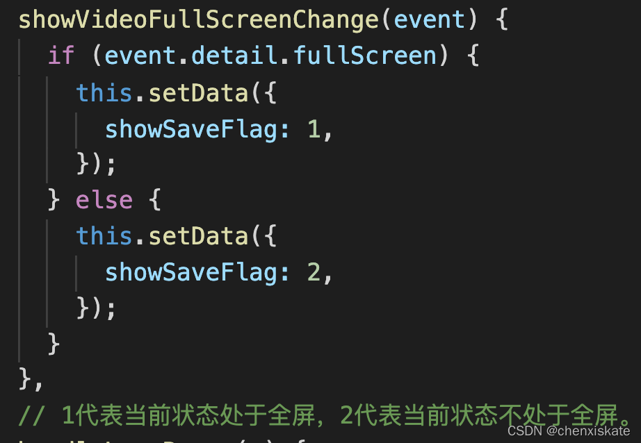 可以用来判断当前视频是否在全屏状态下,我们就可以利用这个属性来设定一个flag值,fullScreen 为 true 的时候,置flag为1,fullScreen 为 false 的时候,置flag为2,然后在 flag 为1 的时候去调用保存视频的方法,至于保存视频的方法我也会在后面分享。