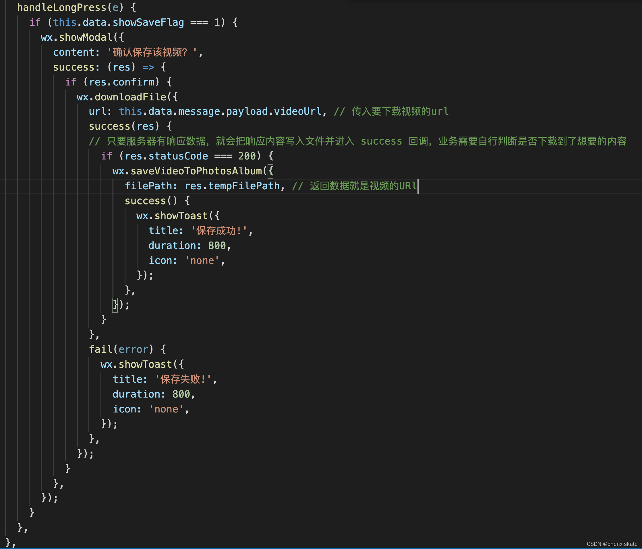 问题二:保存视频会遇到保存图片同样的问题,因为视频播放用的是video组件,保存事件绑定在video组件上,同样不管小窗口还是全屏都会出现保存按钮,那么如何解决这个问题呢?