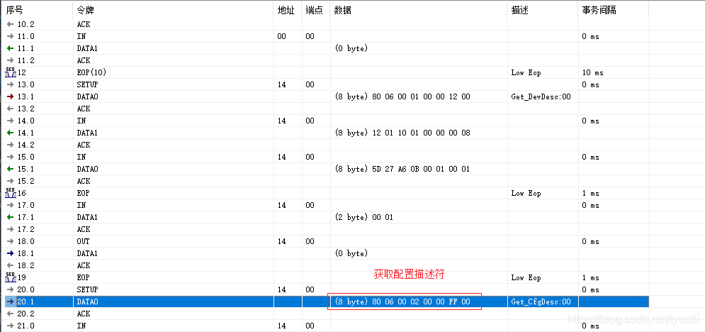 设备描述符获取到之后,下一步就是获取配置描述符,数据过程如下