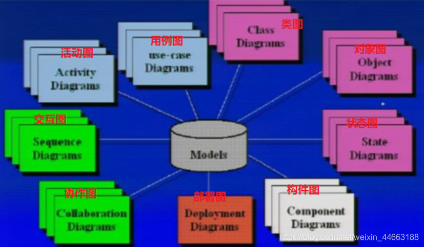 描述系统静态结构:类图,对象图,包图,构件图,部署图
