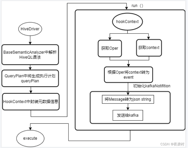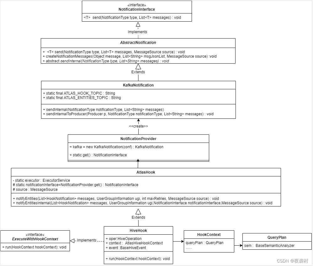 Atlas的HiveHook实现了Hive提供的ExecuteWithHookContext接口的run()方法,通过hive的hookContext,根据oper将context转为event,并通过父类AtlasHook的notifyEntities方法将message发送给kafka。