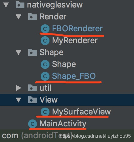 首先是工程结构,FBO的实现应用了红线的几个文件(其他文件绘制了一个普通的三角形,):