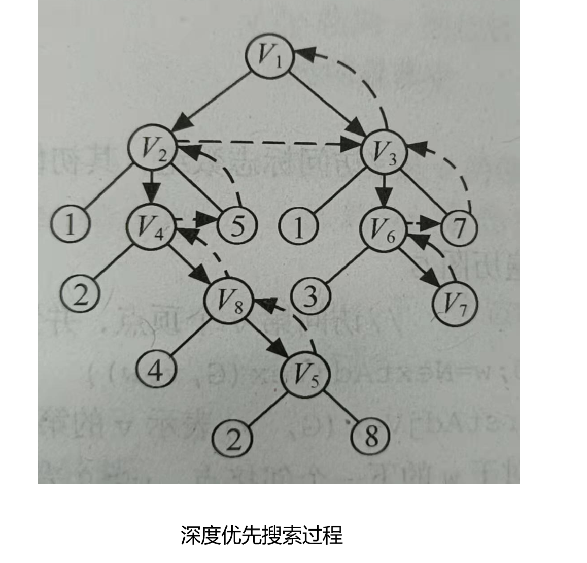 (3)搜索从v5回到v8,由于同样的理由,搜索继续回到v4,v2直到v1,此时由于v1的另一个邻接点未被访问,则又从v1到v3,再继续进行下去。