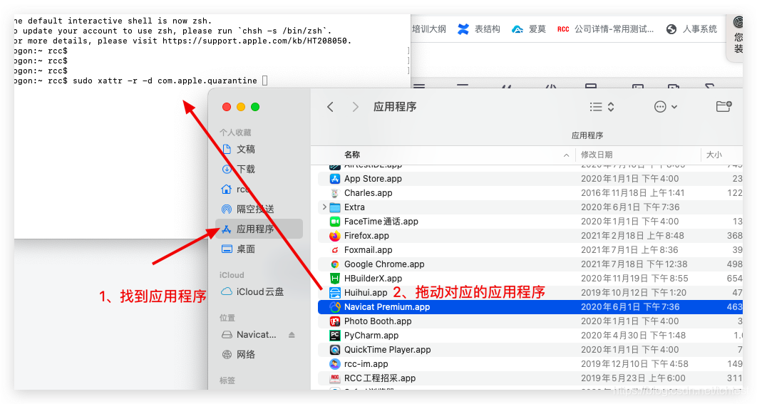 找navicat程序,拖动navicat到终端中,终端自动添加navicat路径