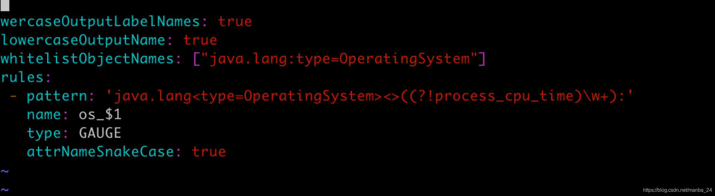 - pattern: 'java.lang<type=OperatingSystem><>((?!process_cpu_time)\w+):'
