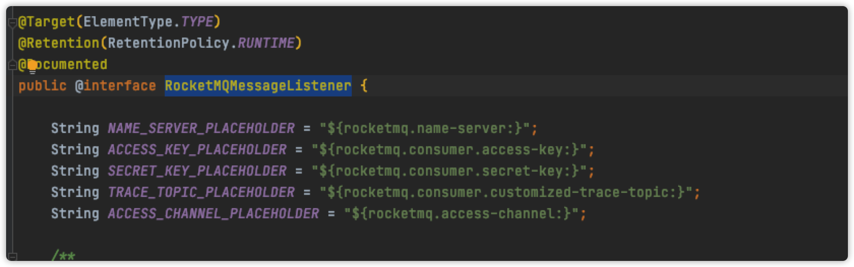 于是乎,查看@RocketMQMessageListener注解发现,似乎支持占位符表达式的写法