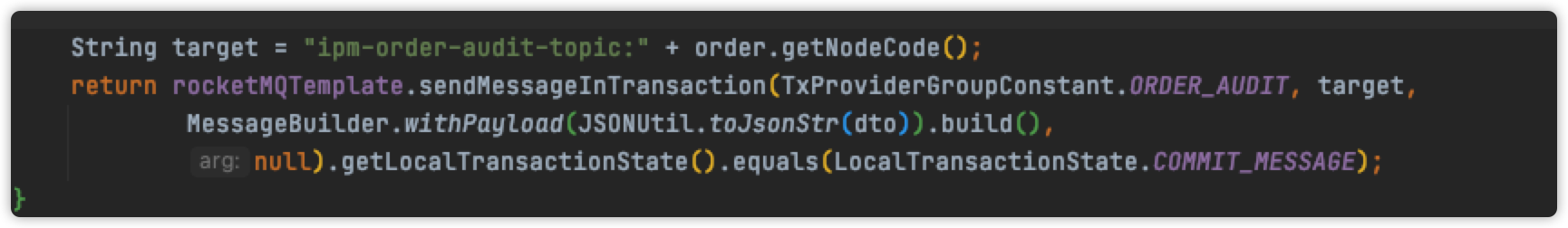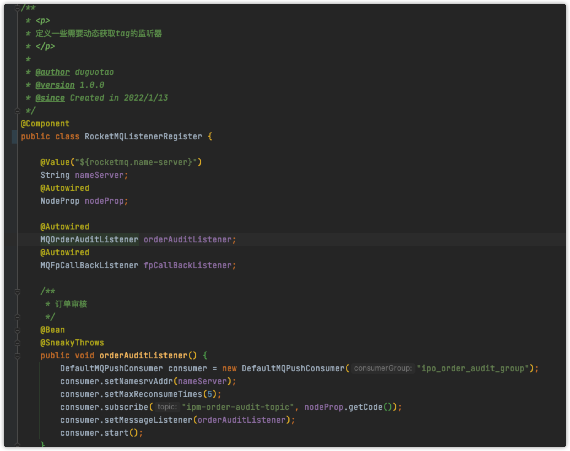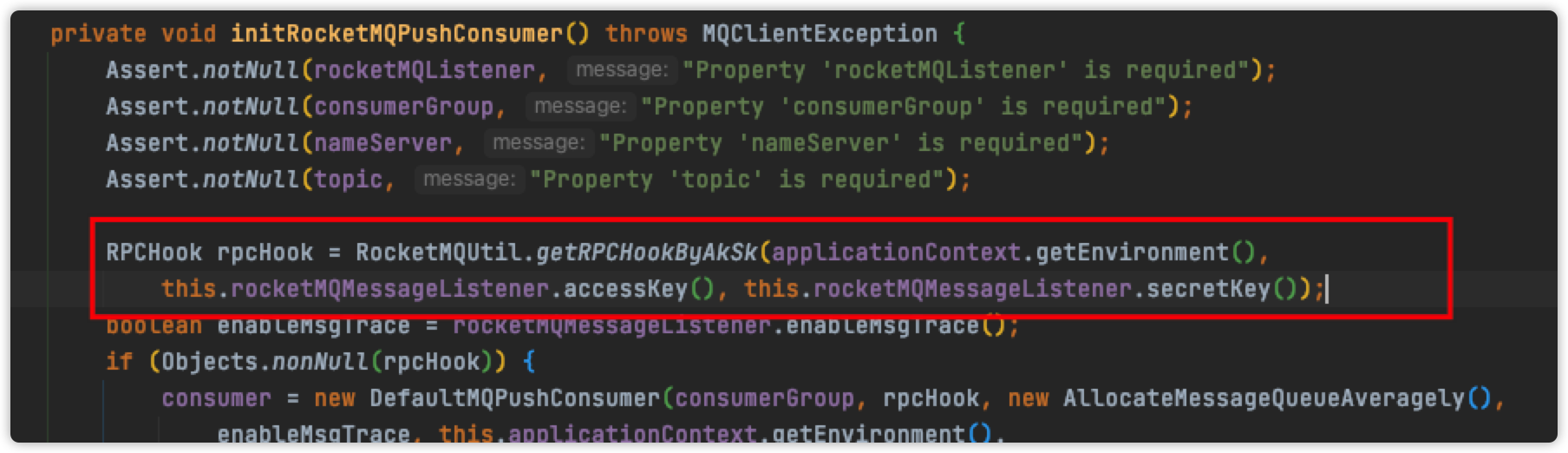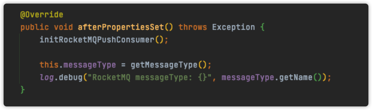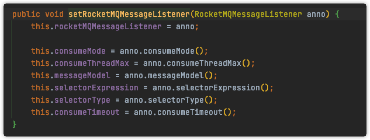 如下代码初始化我们的监听器private DefaultRocketMQListenerContainer createRocketMQListenerContainer(String name, Object bean, RocketMQMessageListener annotation) { DefaultRocketMQListenerContainer container = new DefaultRocketMQListenerContainer(); String nameServer = environment.resolvePlaceholders(annotation.nameServer()); nameServer = StringUtils.isEmpty(nameServer) ? rocketMQProperties.getNameServer() : nameServer; String accessChannel = environment.resolvePlaceholders(annotation.accessChannel()); container.setNameServer(nameServer); if (!StringUtils.isEmpty(accessChannel)) { container.setAccessChannel(AccessChannel.valueOf(accessChannel)); } container.setTopic(environment.resolvePlaceholders(annotation.topic())); container.setConsumerGroup(environment.resolvePlaceholders(annotation.consumerGroup())); container.setRocketMQMessageListener(annotation); container.setRocketMQListener((RocketMQListener) bean); container.setObjectMapper(objectMapper); container.setName(name); // REVIEW ME, use the same clientId or multiple? return container; }设置监听器