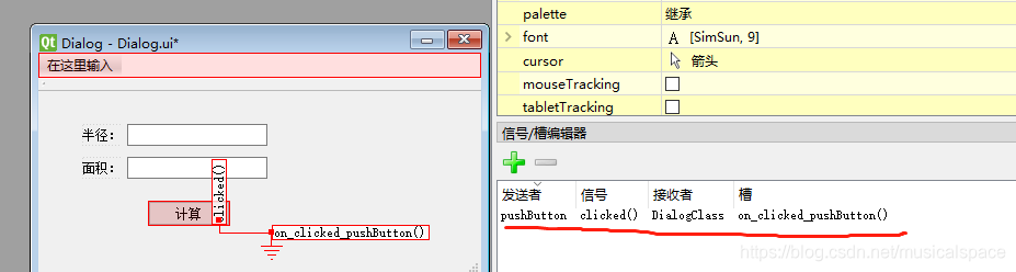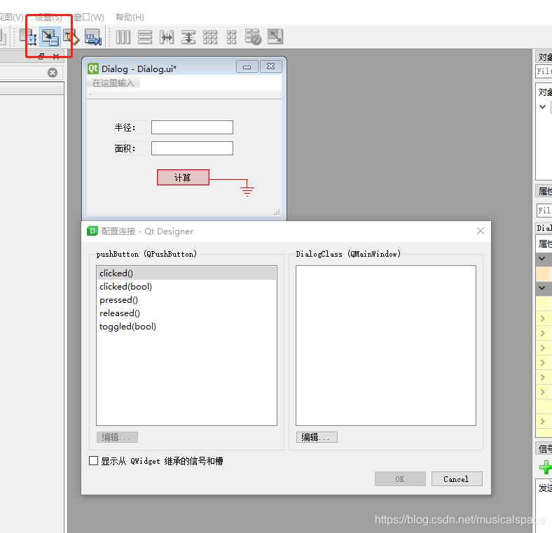 单击菜单栏中的信号/槽按钮,然后选择计算按键,拖动到GND,弹出对话框,我们选择clicked 事件,编辑,然后添加Slot,并命名为 on_clicked_pushButton(), 这样内部就自动将 clicked 事件与 on_clicked_pushButton() 这个slot 绑定,后面在代码中声明这样一个slot 就可以处理clicked事件了。