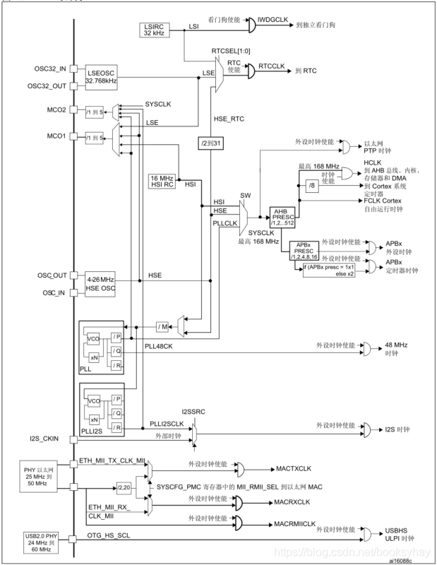 注意:官方例程中开发板使用的外部晶振是8M的,PLL的预分频系数M是8,倍频系数N是336,再2分频到得168M。