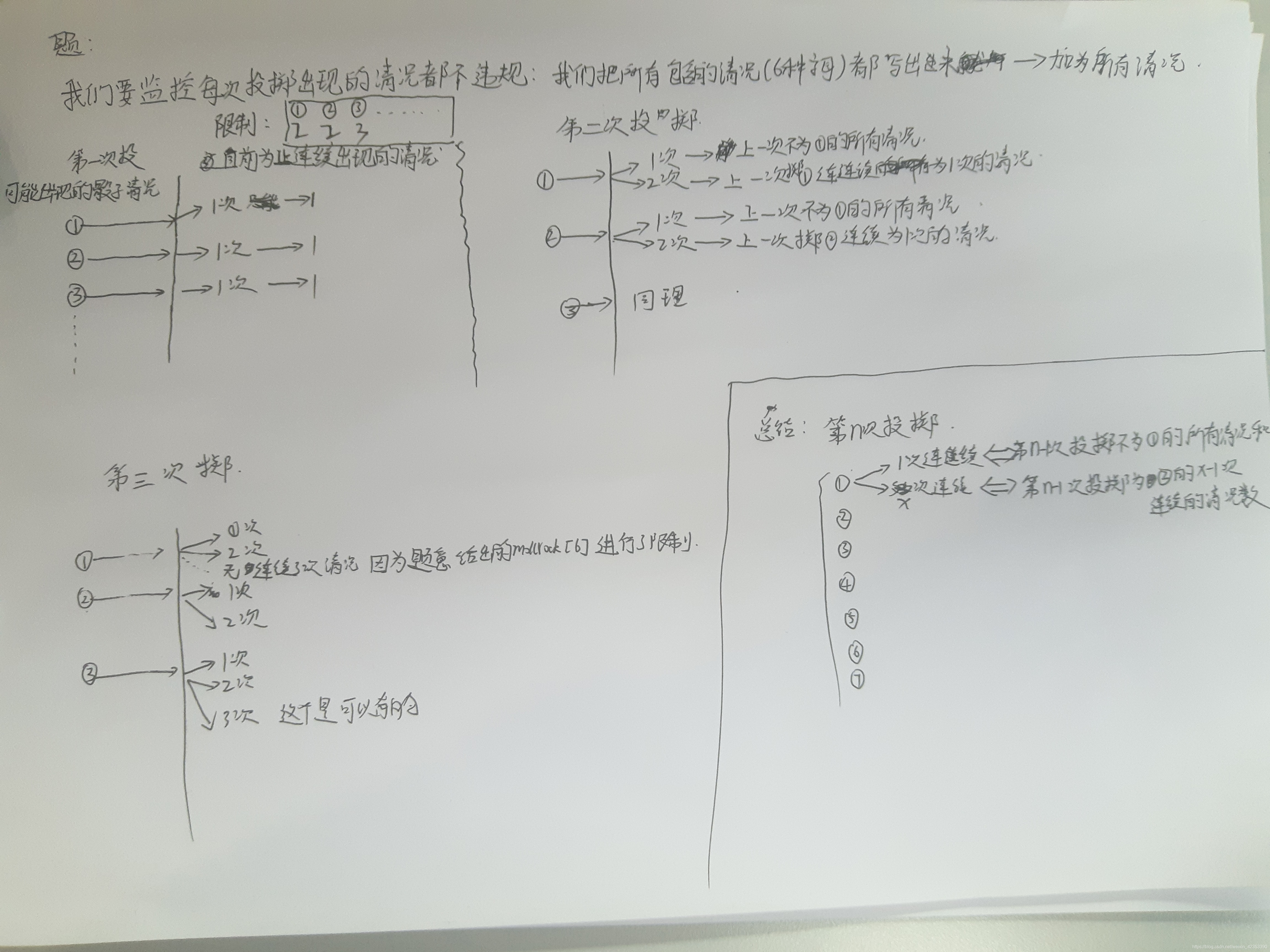 * todo 题意解析: * 题意要求对出现的字符不能连续出现x个 * * 所以按照正常节奏我们很快想出了一个错误的思路: * 把每个字符连续出现的错误的情况求出来,然后用 * 所有可能出现的情况减去这些错误的情况; * * todo 这种思路为什么错了呢? * 这是因为错误的情况和错误的情况可能会组合在一块,这样就会使我们求出的错误的情况变多 * * * todo 正确思路: * todo 抓住题意的要求 :推进的过程中,每个字符都不能连续出现超过他的限制,这样我们就要监控整个 * todo 投掷推进的过程;要保证推进过程中的每一步不违背限制; * todo 很明显 : 这道题 用到了推进的思路, 后面的状态由承接前面的状态;-------》动态规划;