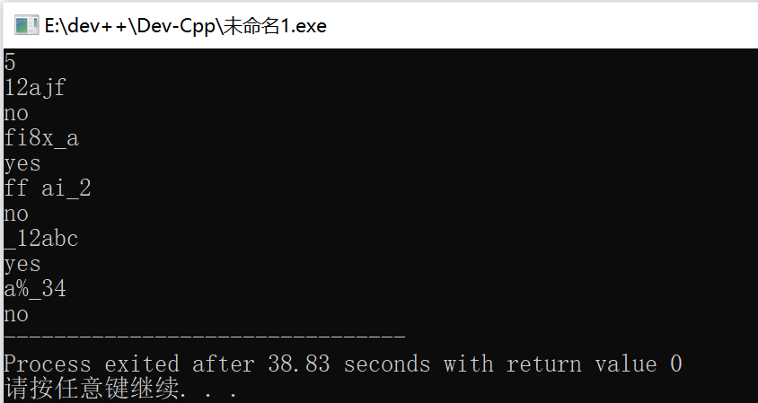 对于每组输入数据,输出一行。如果输入数据是C的合法标识符,则输出”yes”,否则,输出“no”。