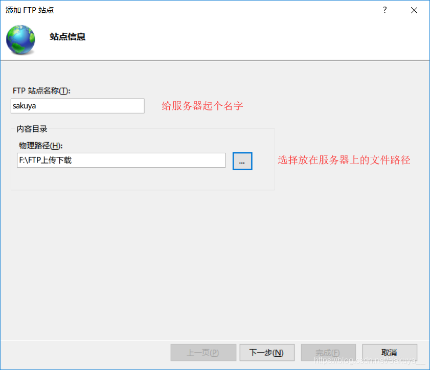 按照提示填写站点信息, 物理路径从自己本地选择要放在服务器上的文件夹,我这里路径是用于测试的F盘下的FTP上传下载文件夹,填写完后点击下一步。