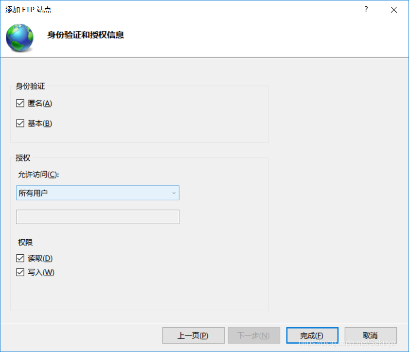 最后是身份验证和授权信息,勾选完毕点击完成。就能看到我们已经创建好了一个我们自己的FTP服务器。