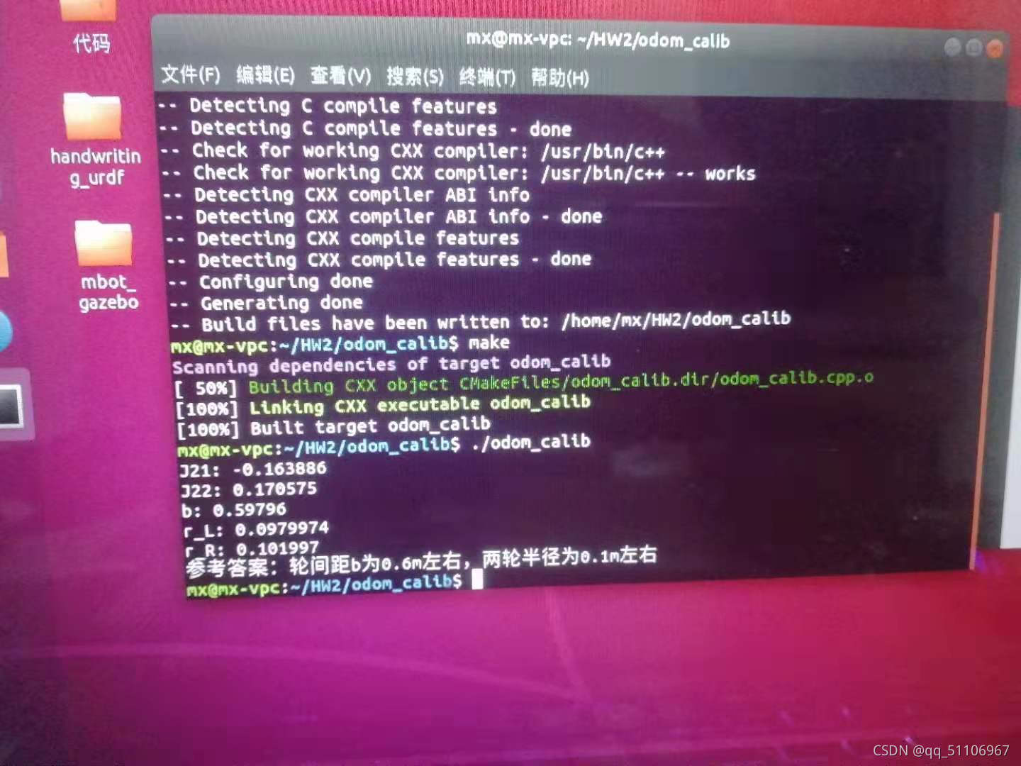 在odom_calib文件夹下打开终端,运行cmake . make进行编译,./odom_calib运行可执行文件。