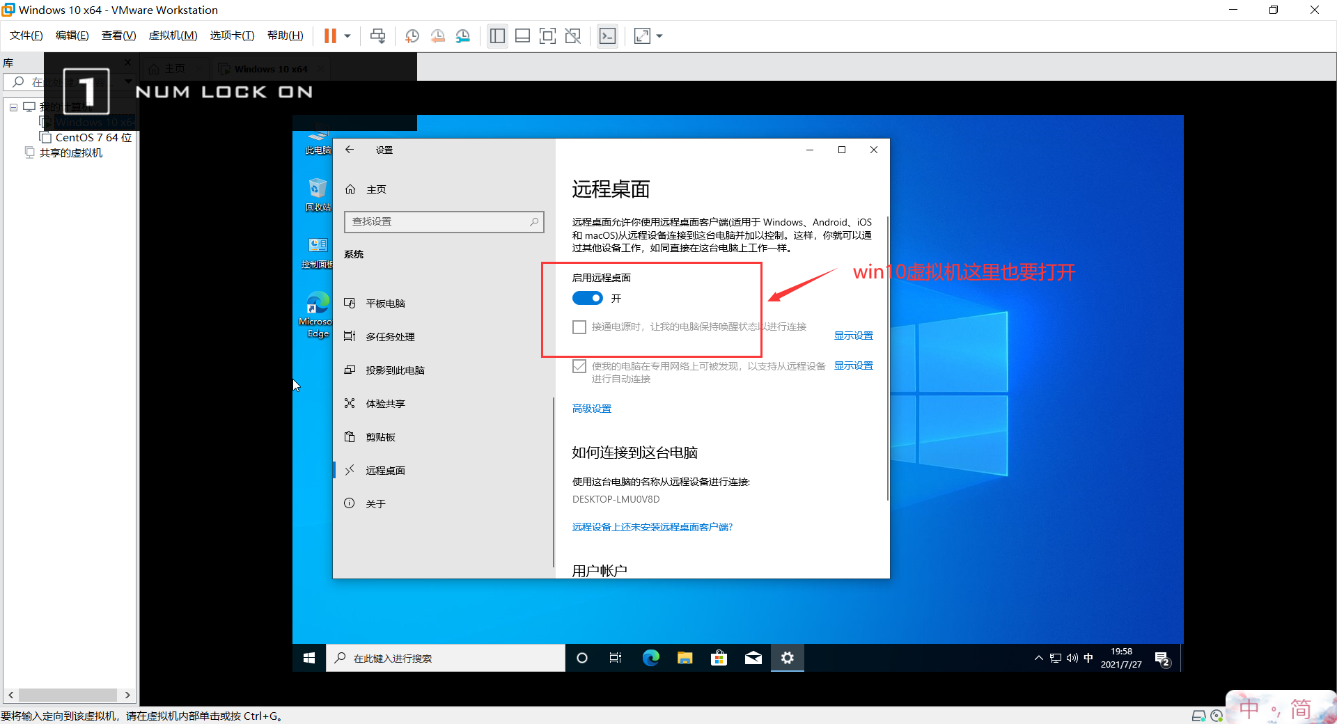 2. 启动win10虚拟机,打开虚拟机的启用远程桌面;