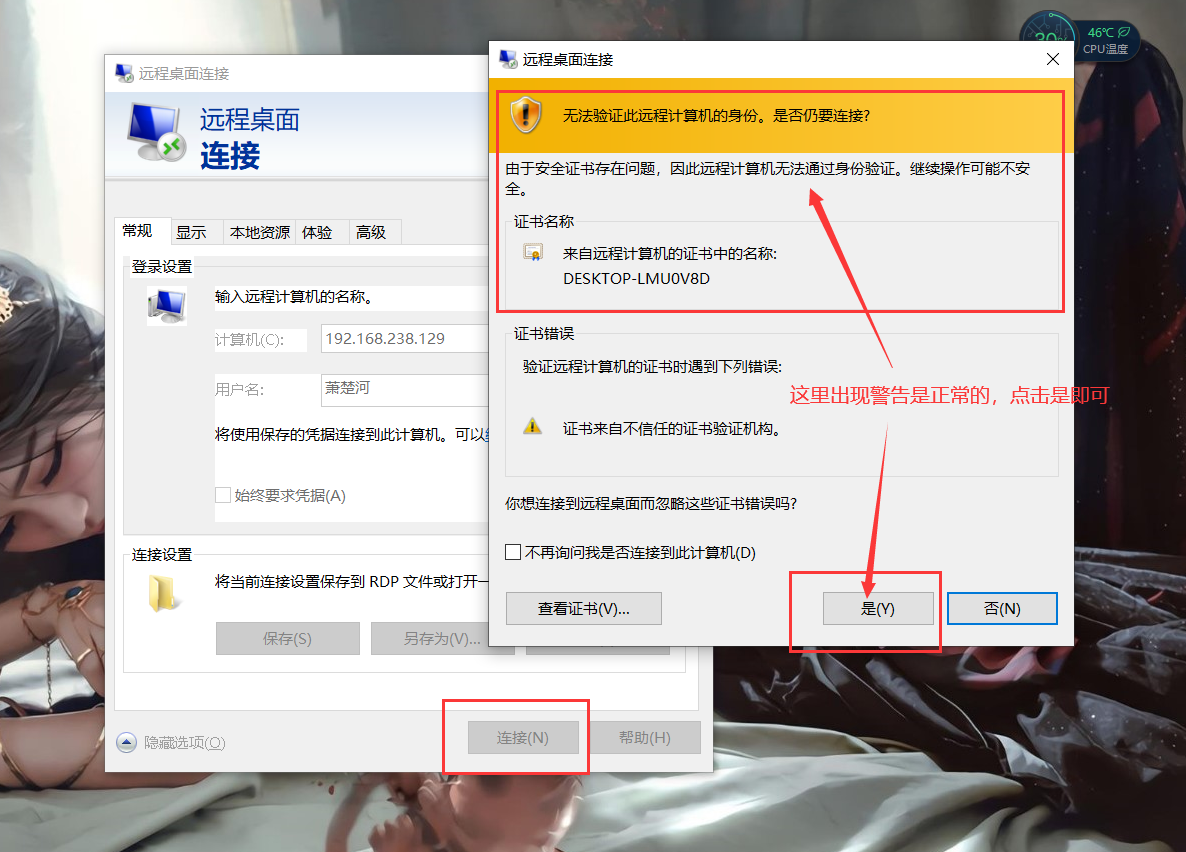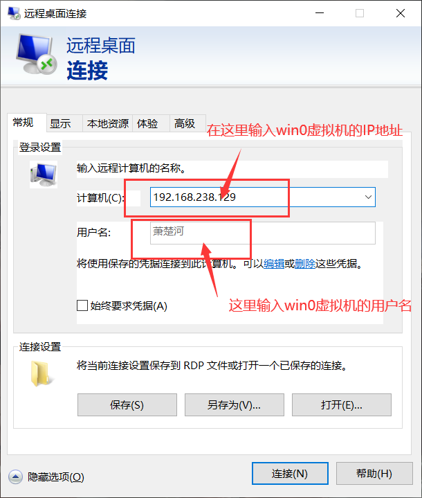 7.之后跳到了远程桌面连接,这里要输入虚拟机的IP地址还有用户名;