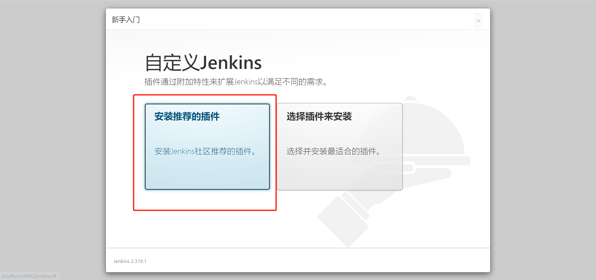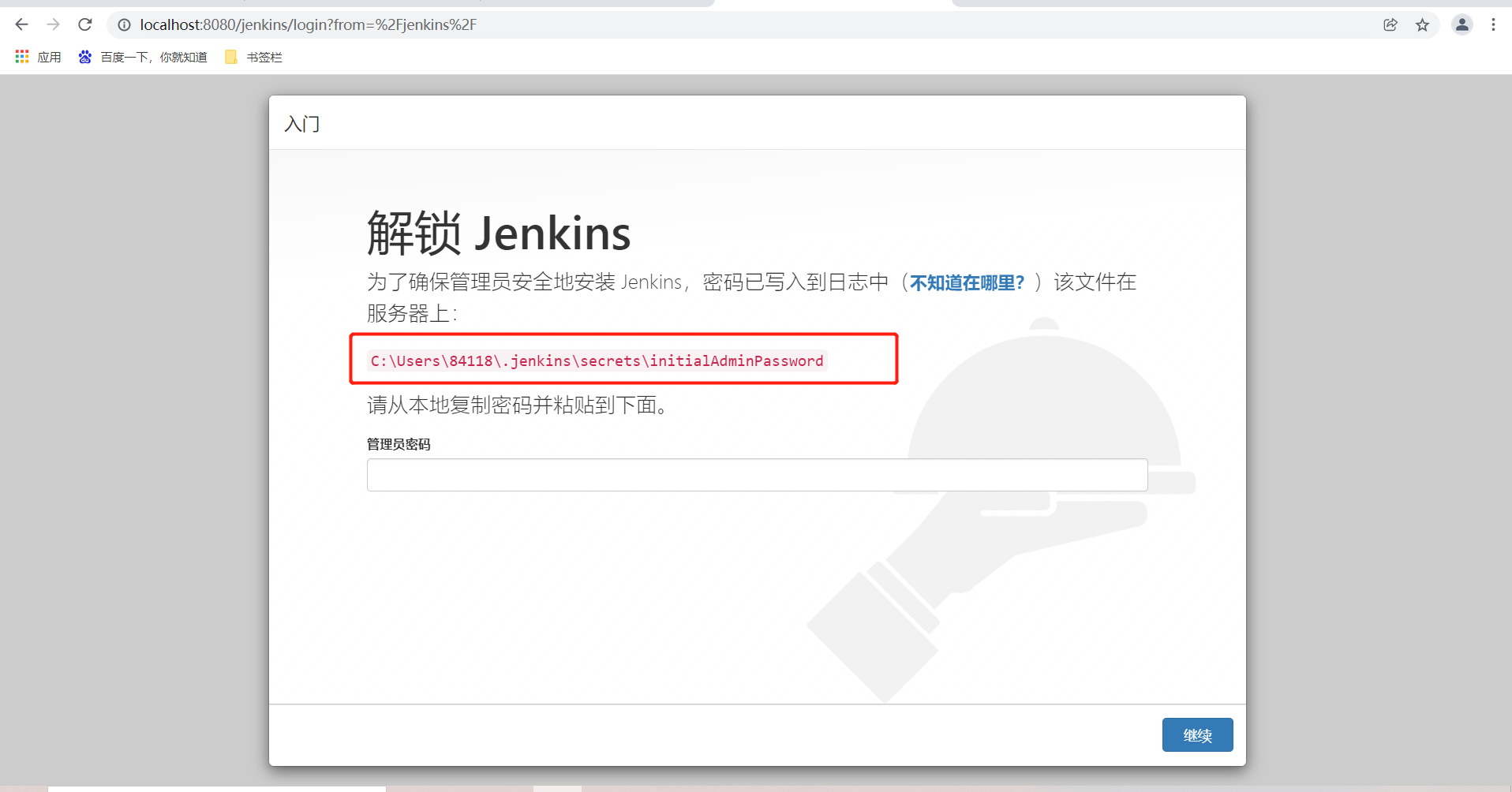 8.打开浏览器,地址栏输入localhost:8080/jenkins,回车即可