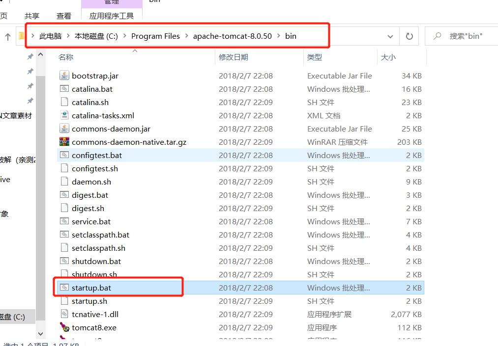6.进入tomcat的bin目录内,找到startup.bat,右击以管理员方式运行