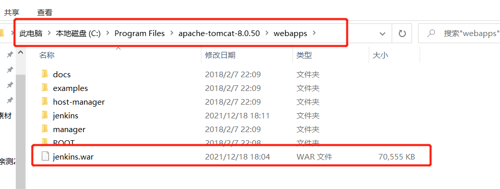 5.将此war包放入tomcat安装路径的webapps文件夹内,如图所示(不用解压)