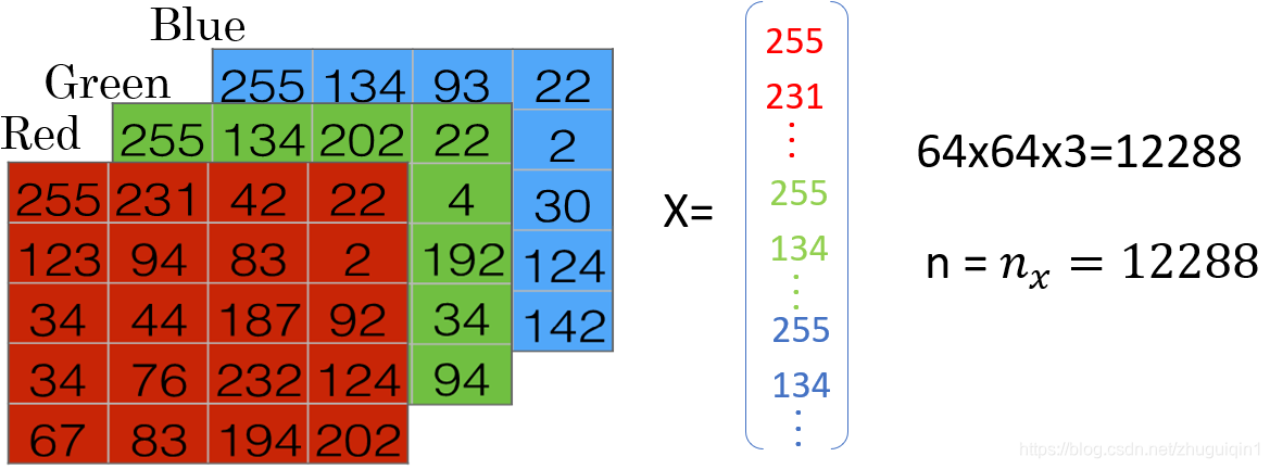 为了用向量表示这些像素矩阵,我们将把这些矩阵中的像素的值展开,使其成为一个向量x,这个向量x作为算法的输入。为了将这些像素的值展开成为一个向量,我们所做的就是按下面方法定义一个与该图像相对应的向量。我们直接将255、231、42…..等这些红色通道像素的值取出放入向量x中,接着放入绿色通道像素的值255、134、202…等代表绿色通道的像素值,最后是红色蓝色通道的像素值,最终我们会得到一个非常长的向量。向量中列出了图像中红、绿、蓝,三个通道的像素值。如果图像的大小是64×64。那么该向量的维度将会是64x64x3,这就是图像的矩阵包含的元素总数。在这个例子中,向量的总长度为12288也就是64x64x3的乘积,