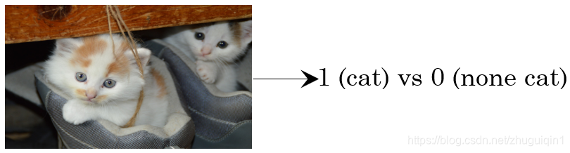 让我们来举例说明,假如有一副下图中含有两只小猫的图片,在二分分类中的问题中,我们的目标是训练出一个分类器(classifier)它以特征向量x作为输入预测出结果y是0还是1,也就是预测出图片中是否含有猫。