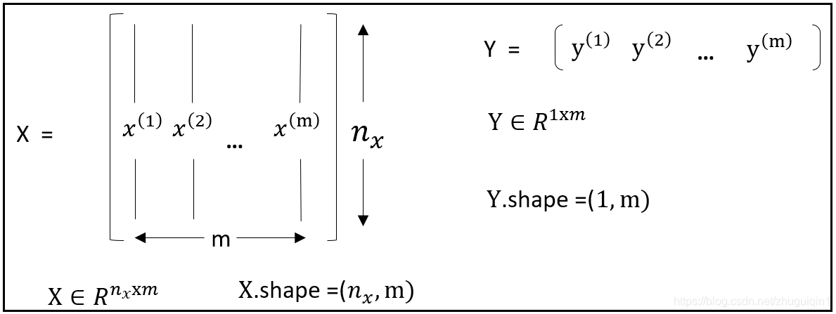 。同样的,使用Python命令Y.shape,将会输出(1,m)表示Y是一个1行m列大小的矩阵。