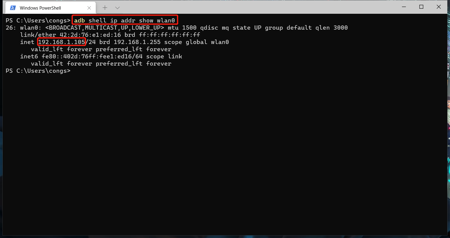 这个命令不需要任何特殊权限,可以直接获取到wlan0,也就是无线网卡WIFI的IP地址。