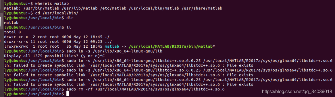 ly@ubuntu:/usr/local/bin$ sudo ln -s /usr/lib/x86_64-linux-gnu/libstdc++.so.6.0.25 /usr/local/MATLAB/R2017a/sys/os/glnxa64/libstdc++.so.6